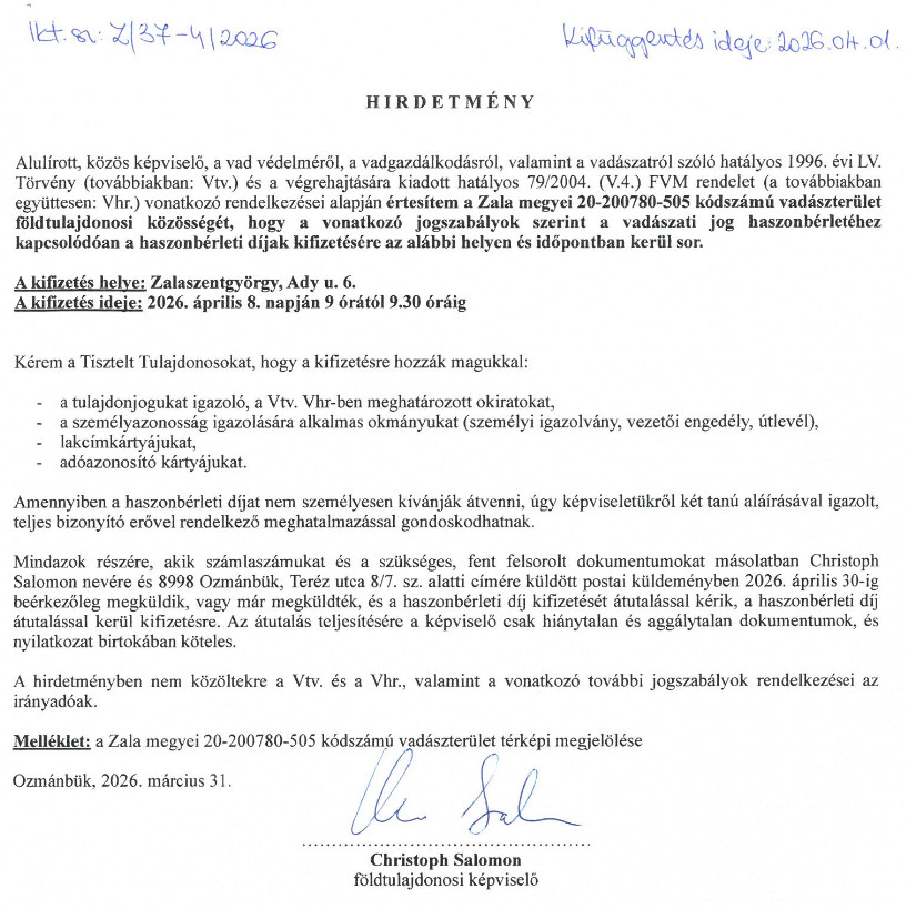 Hirdetmény – haszonbérleti díj kifizetése